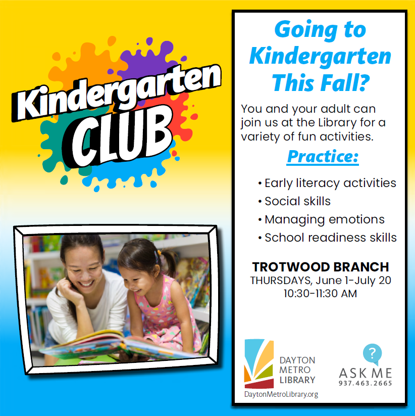 Kindergarten Club is intended for the families of children who are entering kindergarten in fall 2023. Children and caregivers participate together in a variety of fun activities designed to help children prepare for kindergarten. Tips for adults, early literacy activities, social and emotional learning opportunities, and skills that set children up to be successful students will be the focus.