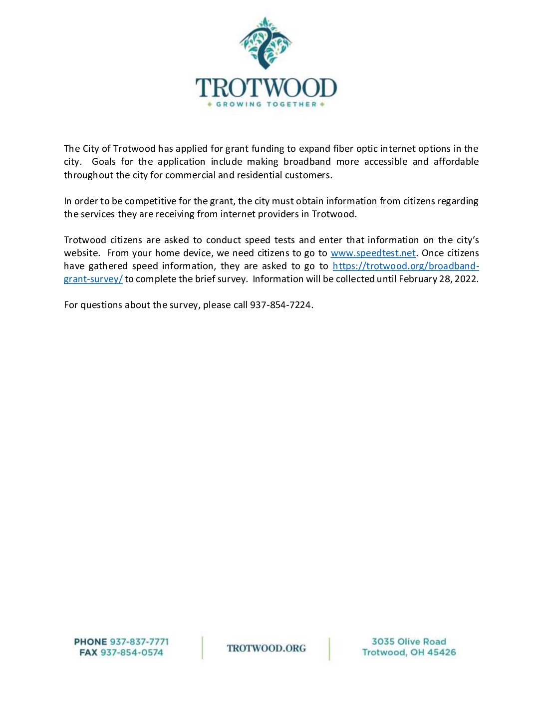 2) Once you have gathered speed information, go to https://trotwood.org/broadband-grant-survey/ to complete the brief survey.