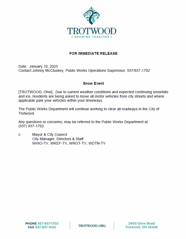 Snow Event ❄️🛣️ Due to current weather conditions and expected continuing snowfalls and ice, residents are being asked to move all motor vehicles from city streets and where applicable park your vehicles within your driveways. The Public Works Department will continue working to clear all roadways in the City of Trotwood. Any questions or concerns, may be referred to the …
