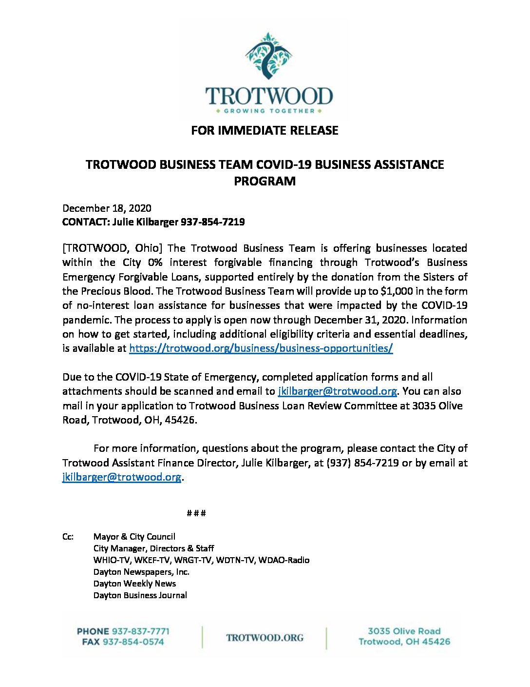 BACKGROUND The City of Trotwood is offering businesses located within the City 0% interest forgivable financing through Trotwood’s Business Emergency Forgivable Loans, supported entirely by the donation from the Sisters of the Precious Blood. This unique financing tool offers forgivable loans to small businesses operating in the City of Trotwood that have been negatively affected by the outbreak of the …
