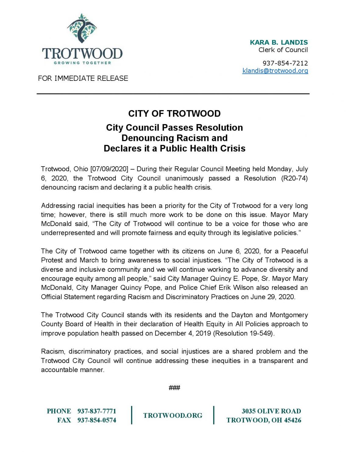 6, 2020, the Trotwood City Council unanimously passed a Resolution (R20-74)