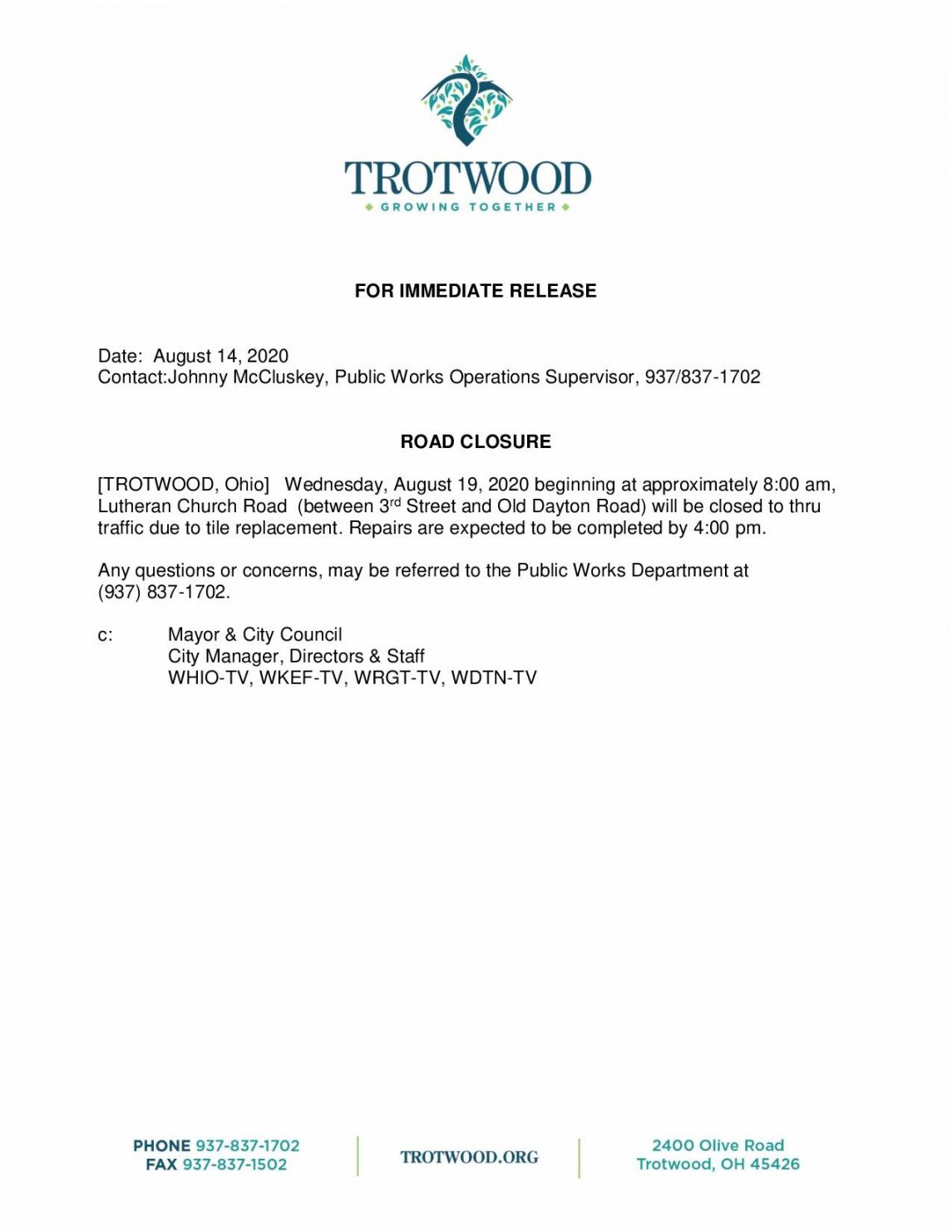 [TROTWOOD, Ohio] Wednesday, August 19, 2020 beginning at approximately 8:00 am, Lutheran Church Road (between 3rd Street and Old Dayton Road) will be closed to thru traffic due to tile replacement. Repairs are expected to be completed by 4:00 pm.