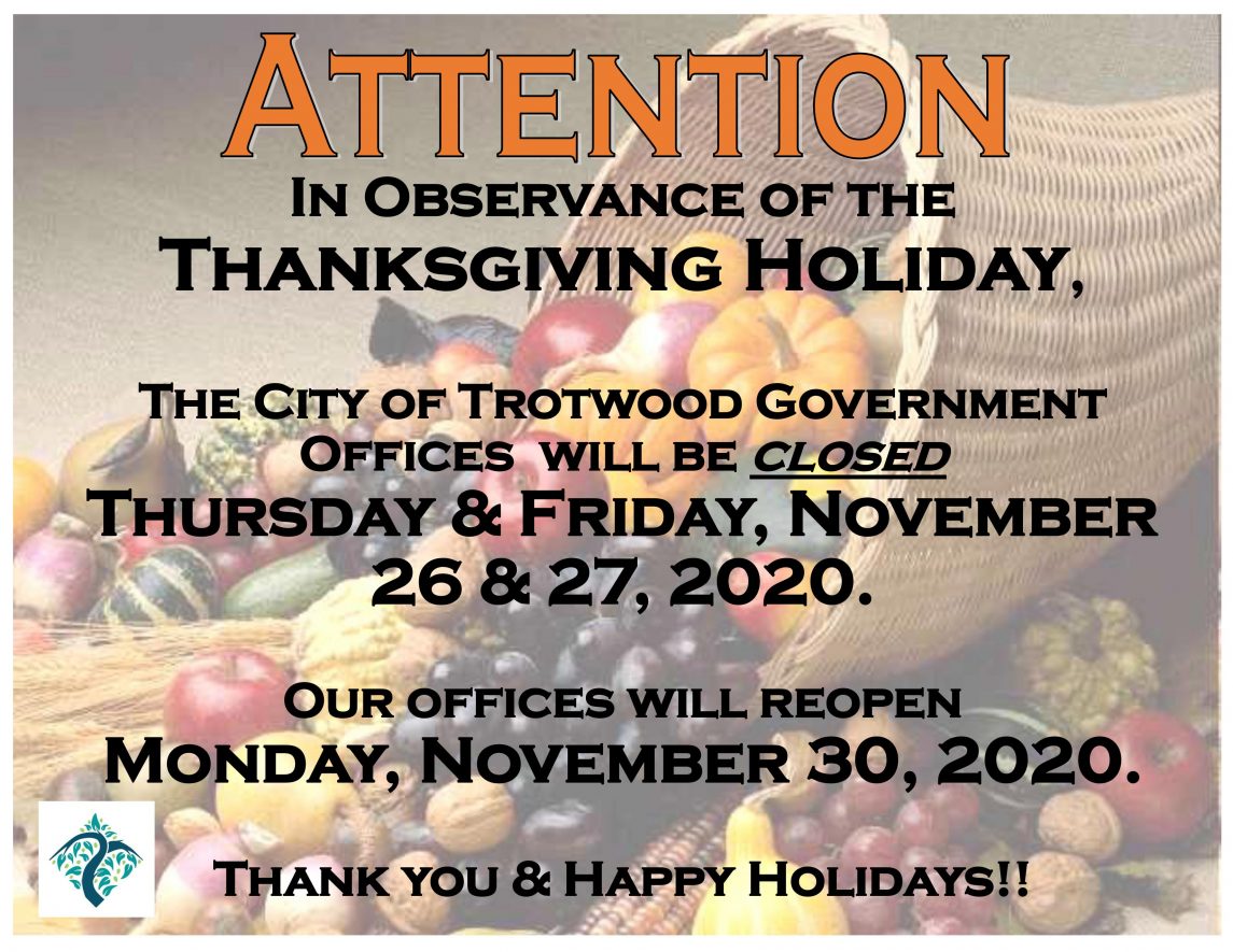 In observance of the Thanksgiving Holiday, The City of Trotwood Government offices will be closed Thursday and Friday, November 26 & 27, 2020.