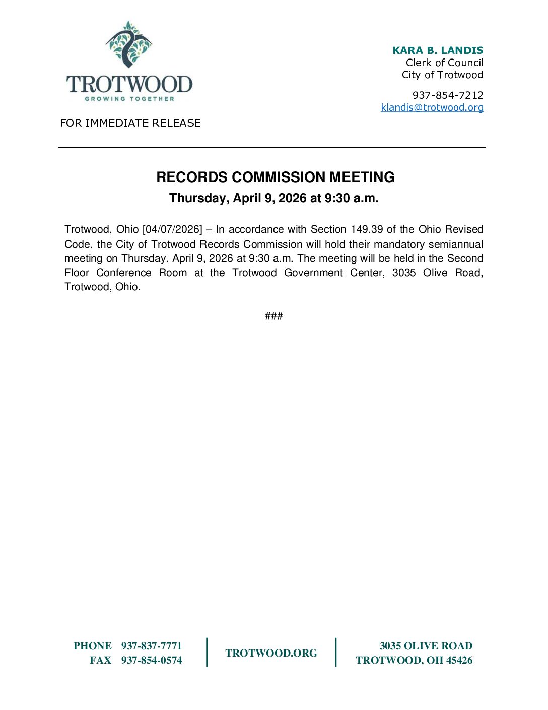 In accordance with Section 149.39 of the Ohio Revised Code, the City of Trotwood Records Commission will hold their mandatory semiannual meeting on Thursday, April 9, 2026 at 9:30 a.m. The meeting will be held in the Second Floor Conference Room at the Trotwood Government Center, 3035 Olive Road, Trotwood, Ohio.