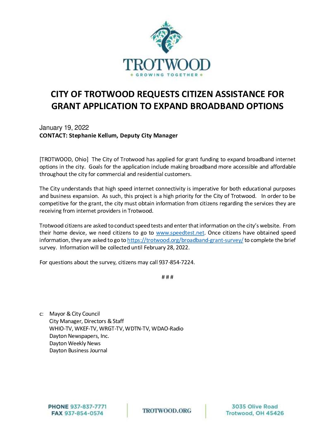 Trotwood citizens are asked to conduct speed tests and enter that information on the city’s website. From their home device, we need citizens to go to www.speedtest.net. Once citizens have obtained speed information, they are asked to go to https://trotwood.org/broadband-grant-survey/ to complete the brief survey. Information will be collected until February 28, 2022.