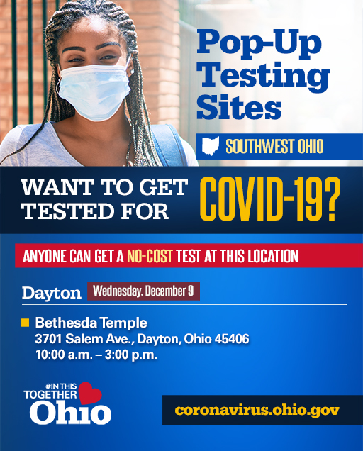 COVID-19 testing will take place Wednesday, December 9th at Bethesda Temple, 3701 Salem Ave., Dayton Oh 45406 from 10am-3pm.