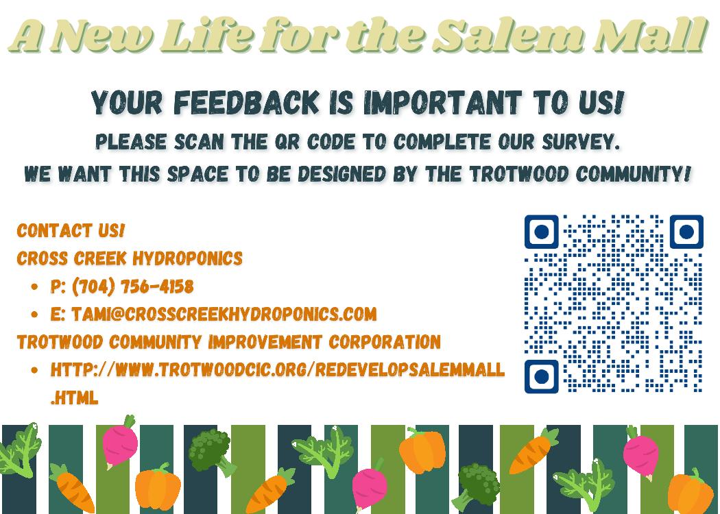 The Trotwood Community Improvement Corporation (TCIC), Cross Creek Hydroponics, and a cohort of University of Dayton Senior Engineering students are working to receive community input on the repurposing of a portion of the former Sears building into a community based market space, that will feature locally grown fresh produce and food products, an educational kitchen, hydroponics, and space to facilitate ongoing community engagement. An online survey is available for the Trotwood community to take part, as we want and value your feedback. The survey will give this group an opportunity to hear from the residents their opinions on the needs of the community related to the marketplace. Your input is crucial to the design and renovation process as the space is meant for Trotwood residents to shop locally and support local food entrepreneurs. The entire survey should take no more than five minutes to complete.