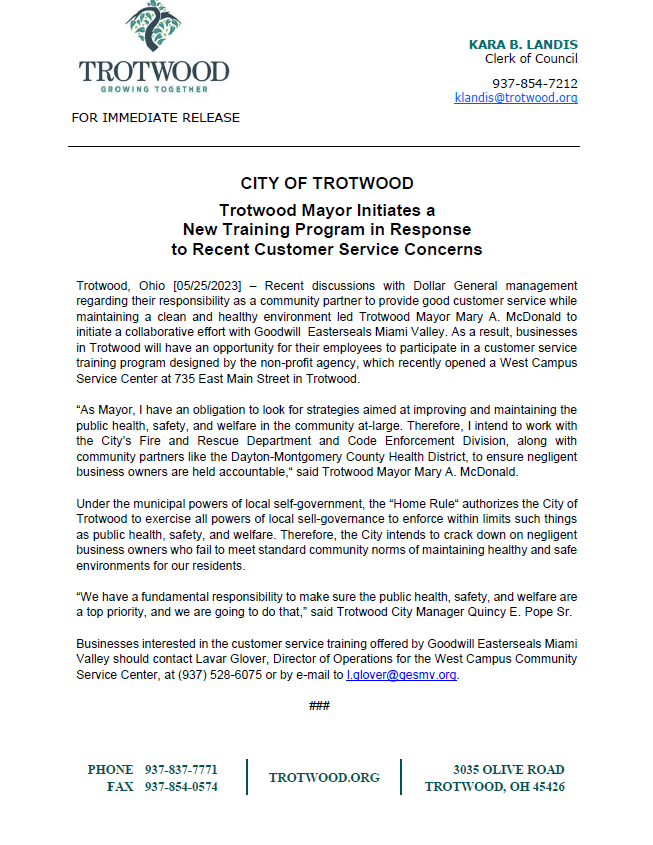 Businesses interested in the customer service training offered by Goodwill Easterseals Miami Valley should contact, Director of Operations, LaVar Glover at 937-528-6075 or via email at [email protected]