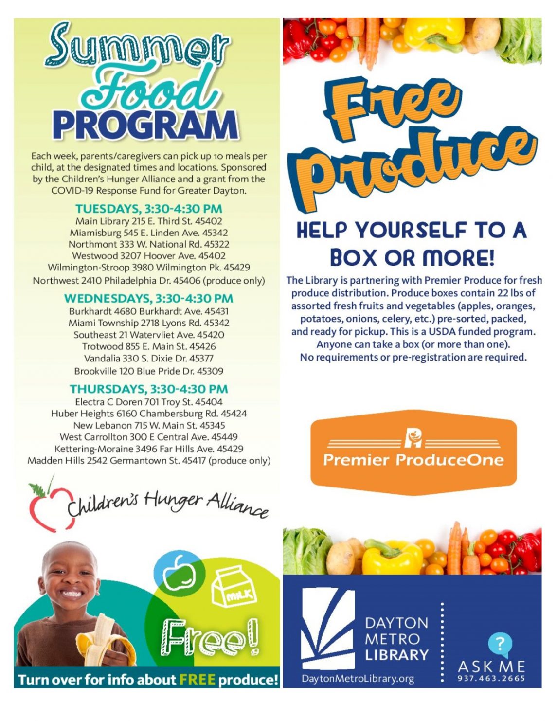 Each week, parents/caregivers can pick up 10 meals per child, at the designated times and locations. Sponsored by the Children’s Hunger Alliance and a grant from the COVID-19 Response Fund for Greater Dayton.