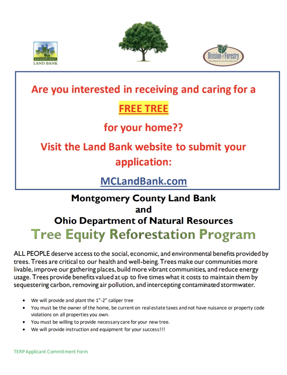 - ODNR and Montgomery County Land Bank will provide and plant the 1″ – 2″ caliper tree, and provide individuals with the instruction and equipment for success!!