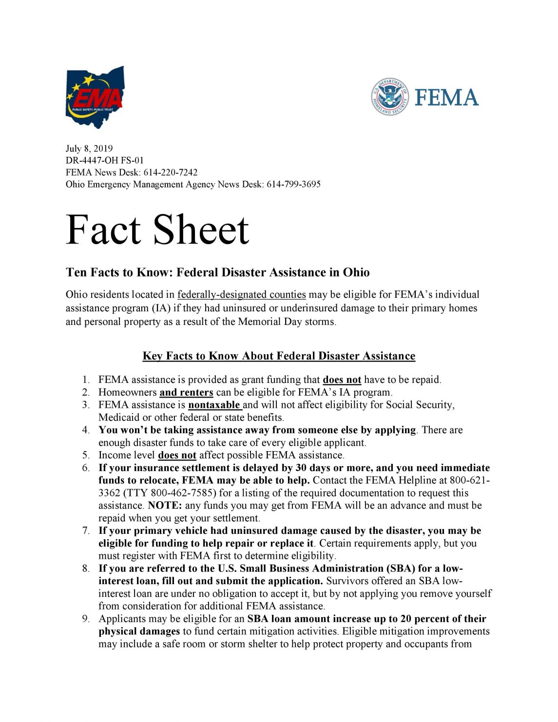 Please click on the link below for key facts about federal disaster assistance in Ohio.