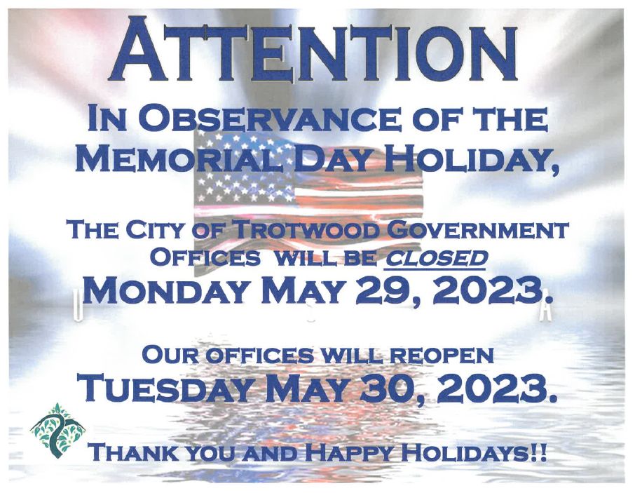 THE CITY OF TROTWOOD GOVERNMENT OFFICES WILL BE CLOSED MONDAY MAY 29, 2023
