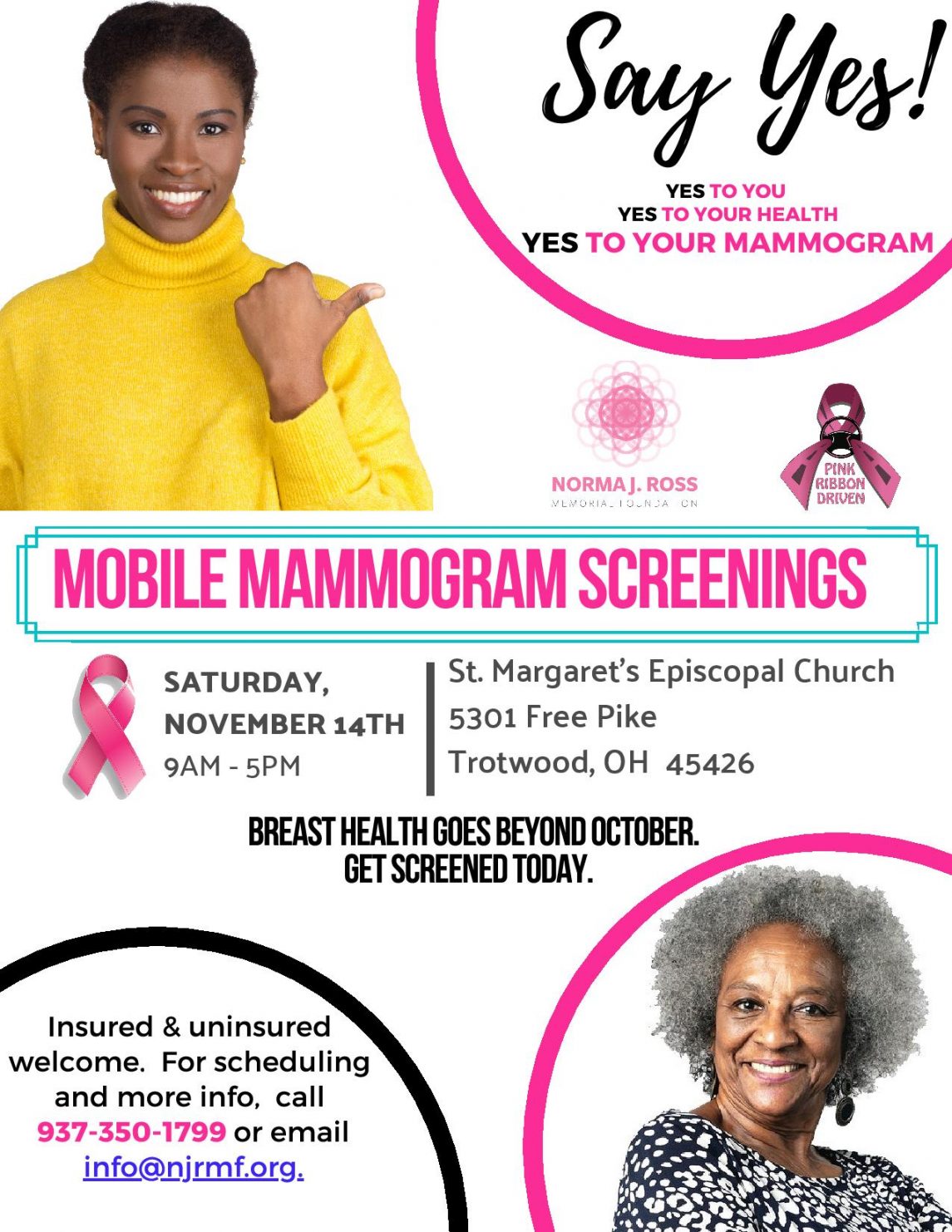 Mobile mammogram screenings will take place Saturday, November 14th from 9am-5pm at St. Margaret’s Episcopal Church (5301 Free Pike Trotwood, Oh 45426).