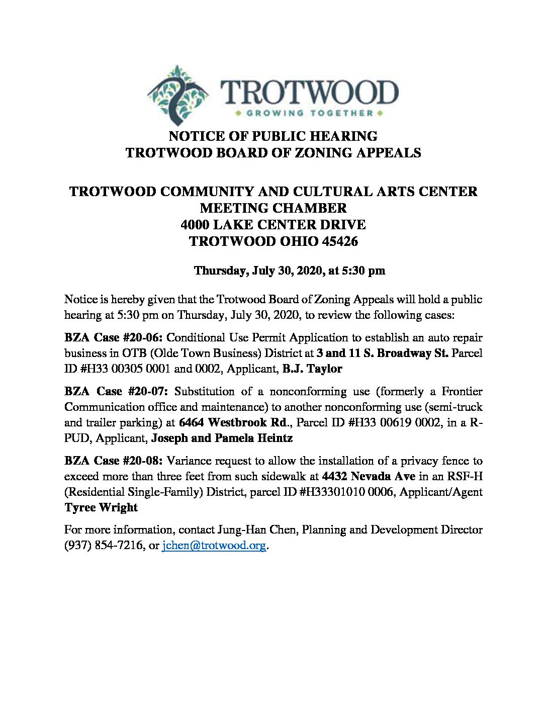 The Trotwood Board of Zoning Appeals will hold a public hearing at 5:30 pm on Thursday, July 30, 2020, at the Trotwood Community and Cultural Arts Center Meeting Chamber, 4000 Lake Center Dr, Trotwood, OH 45426.