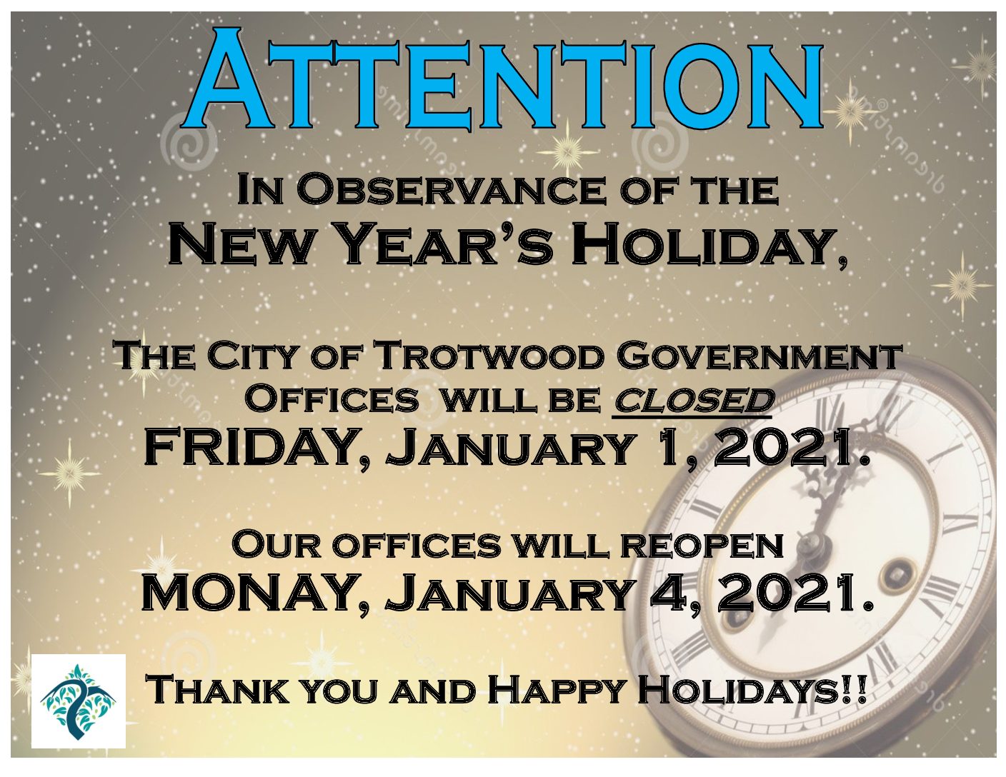 In observance of the New Year’s Holiday, the City of Trotwood Government offices will be closed Friday, January 1, 2021.