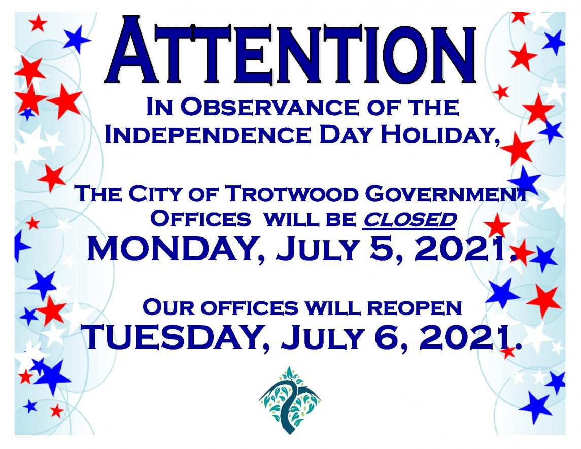 The City of Trotwood Offices will be closed on Monday, July 5, 2021, in observance of the Independence Day Holiday. Our offices will reopen Tuesday, July 6, 2021.