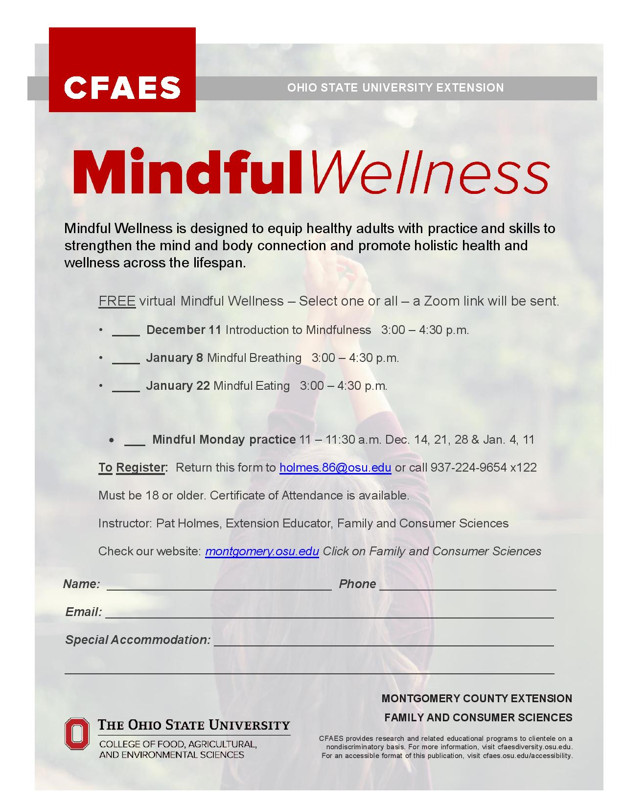 Ohio State University Extension has a FREE series of 3 virtual Mindful Wellness series and/or a Mindful Monday 30 minute practice being offered by OSU Extension, Montgomery County via Zoom.