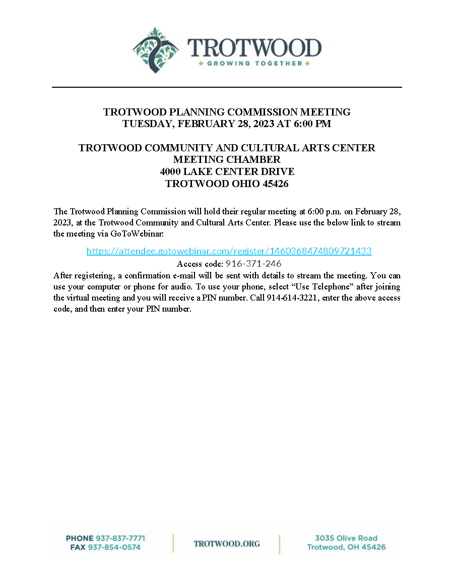 The Trotwood Planning Commission will hold a public meeting at 6:00 p.m. on February 28, 2023, at the Trotwood Community and Cultural Arts Center.