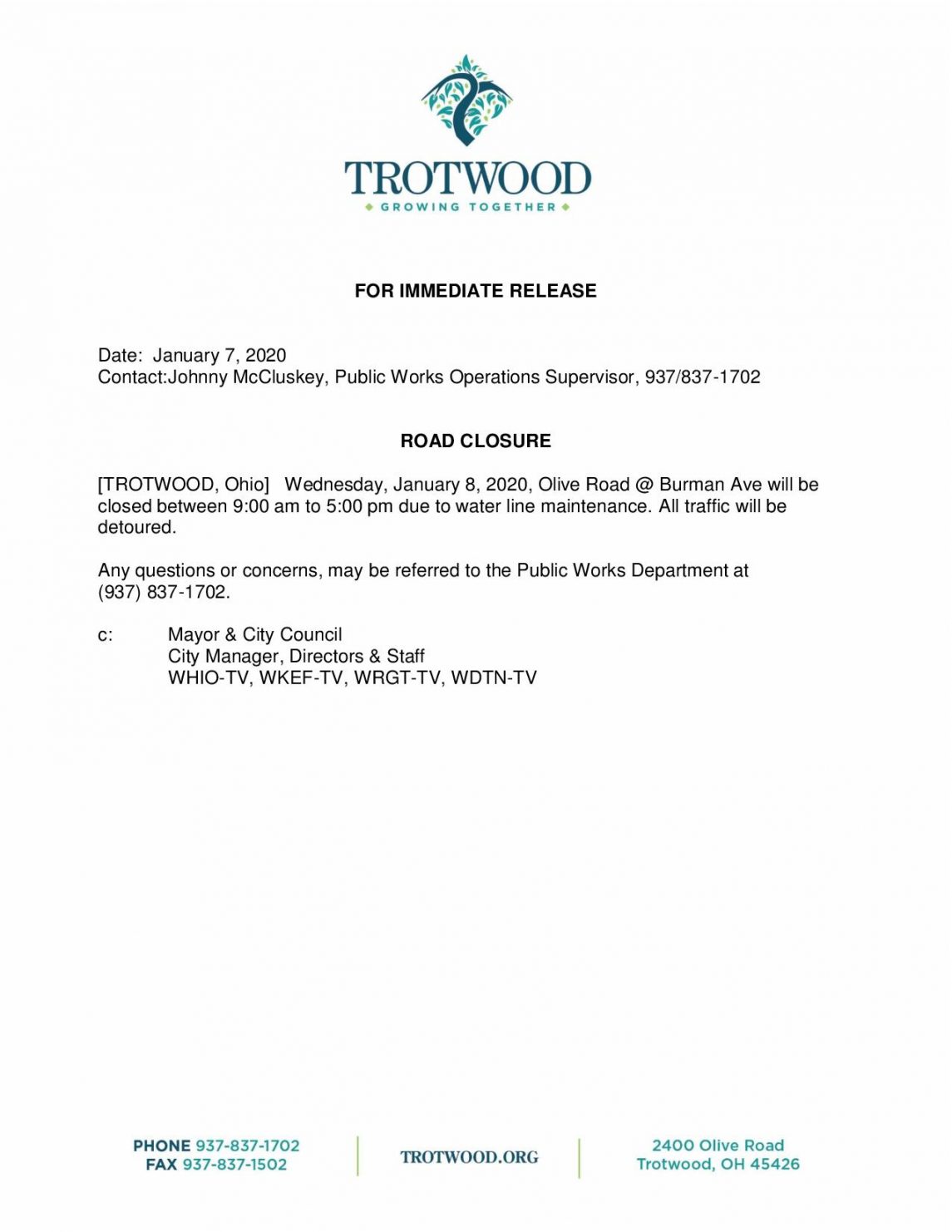 Road Closure- Wednesday, January 8, 2020 catapult January 7, 2020Community News, Road Closure Road Closure- Wednesday, January 8, 2020 Intersection of Olive Road and Burman Ave < Prev PostBack to NewsNext Post > Share this Post