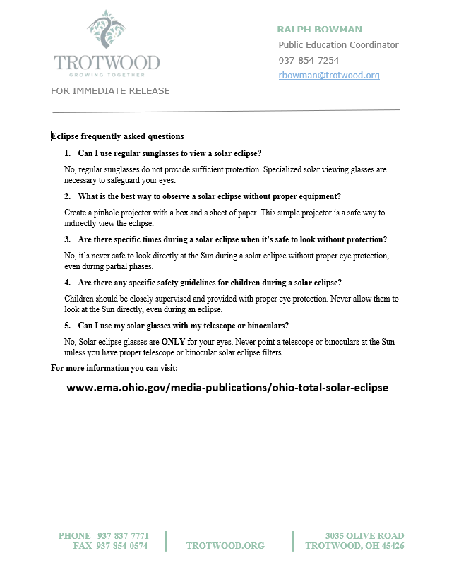Total Solar Eclipse FAQ’s Charles Wheeler March 1, 2024Community News < Prev PostBack to NewsNext Post > Share this Post