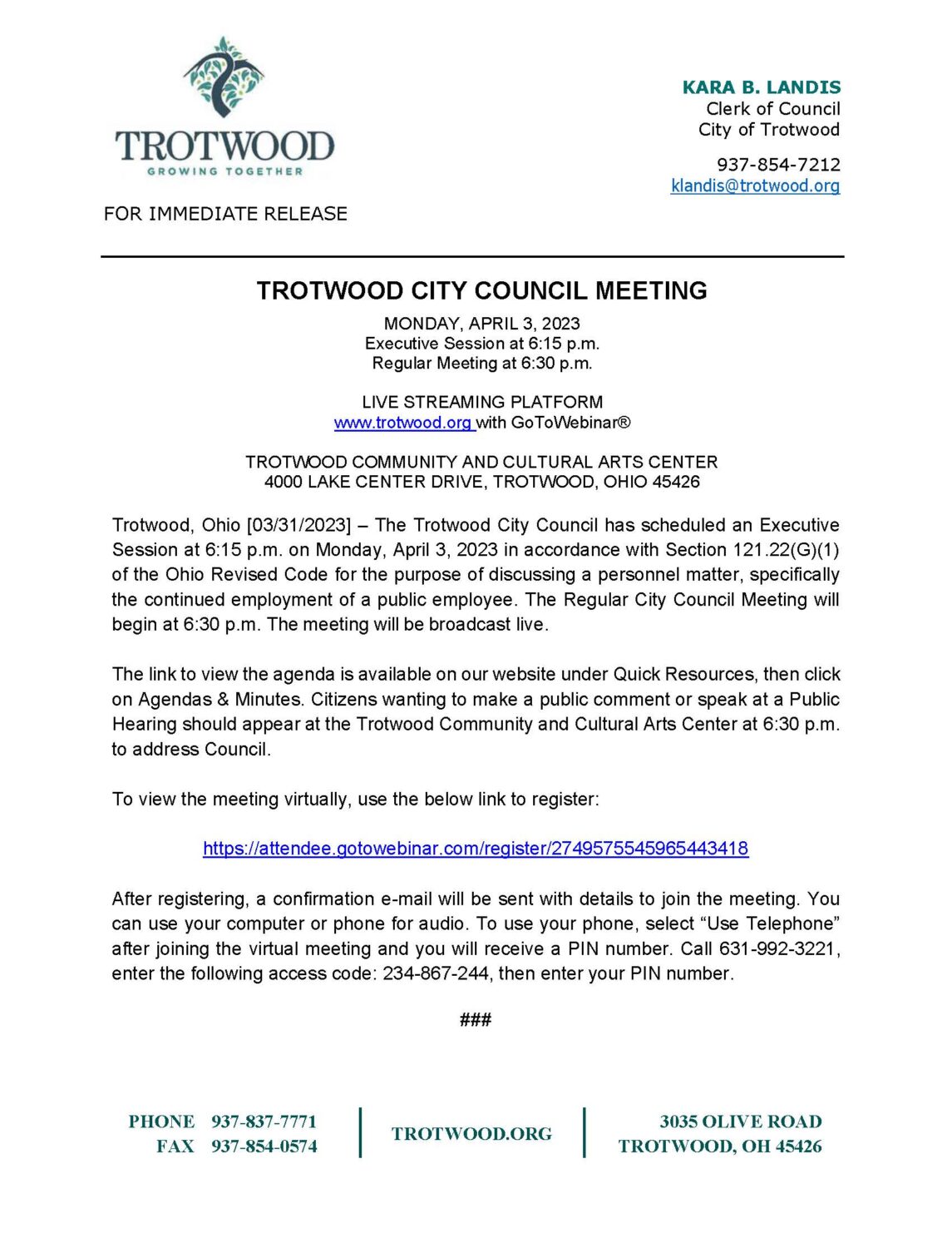 The Trotwood City Council has scheduled an Executive Session at 6:15 p.m. on Monday, April 3, 2023 in accordance with Section 121.22(G)(1) of the Ohio Revised Code for the purpose of discussing a personnel matter, specifically the continued employment of a public employee. The Regular City Council Meeting will begin at 6:30 p.m. The meeting will be broadcast live.