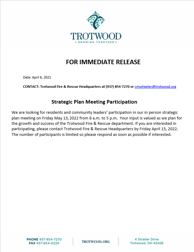The Trotwood Fire & Rescue department is asking for your input during their strategic planning meeting on Friday, May 13, 2022 from 8am – 5pm. Your opinion and feedback matters in the community, come out and have your voice heard! Participation is LIMITED, please contact Trotwood Fire & Rescue Headquarters (937) 854-7270 or [email protected] by April 15th to participate.