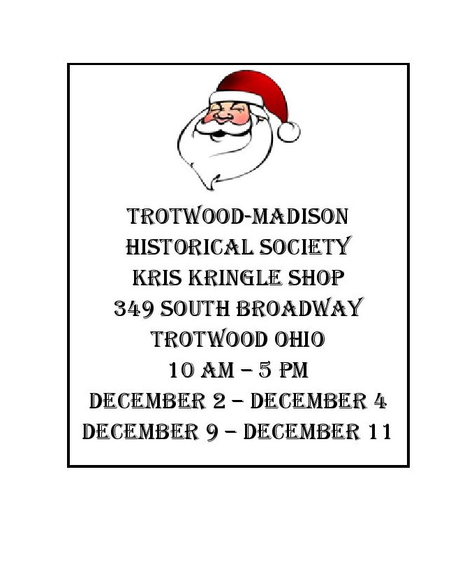 The Trotwood-Madison Historical Society’s Kris Kringle Shop will be open 10 AM – 5 PM December 2, 3, 4 and December 9, 10, 11 from 10:00 am – 5:00 pm.