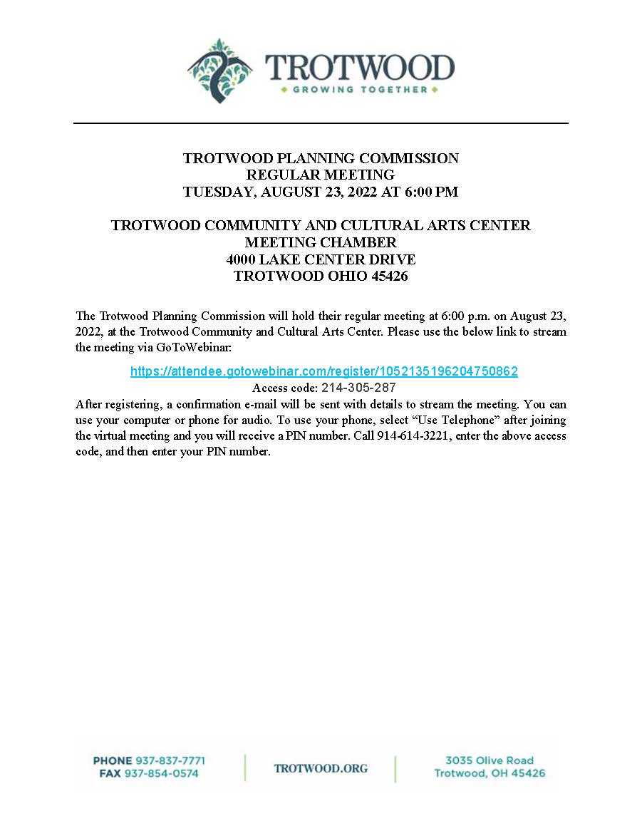 The Trotwood Planning Commission will hold their regular meeting at 6:00 p.m. on August 23, 2022, at the Trotwood Community and Cultural Arts Center. Please use the below link to stream the meeting via GoToWebinar: