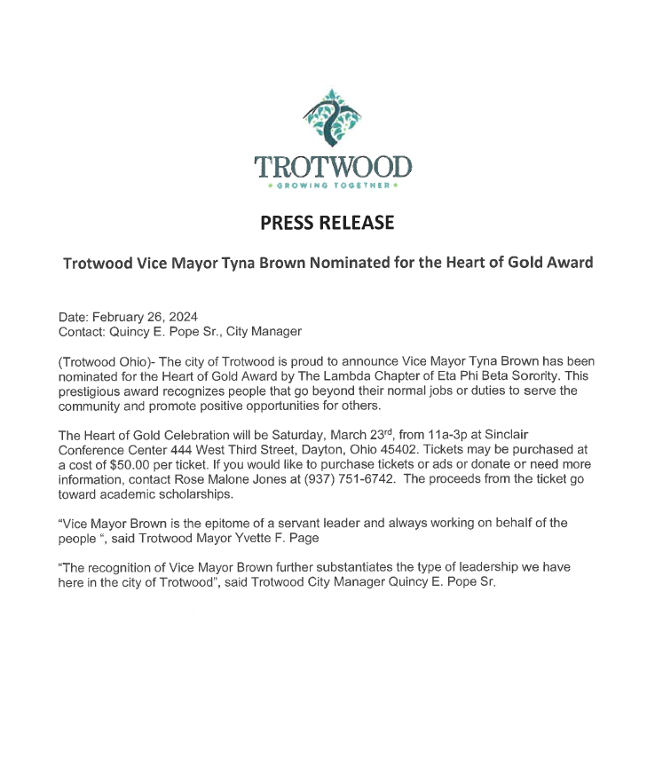 The City of Trotwood proudly announces that Vice Mayor Tyna Brown has been nominated for the Heart of Gold Award!