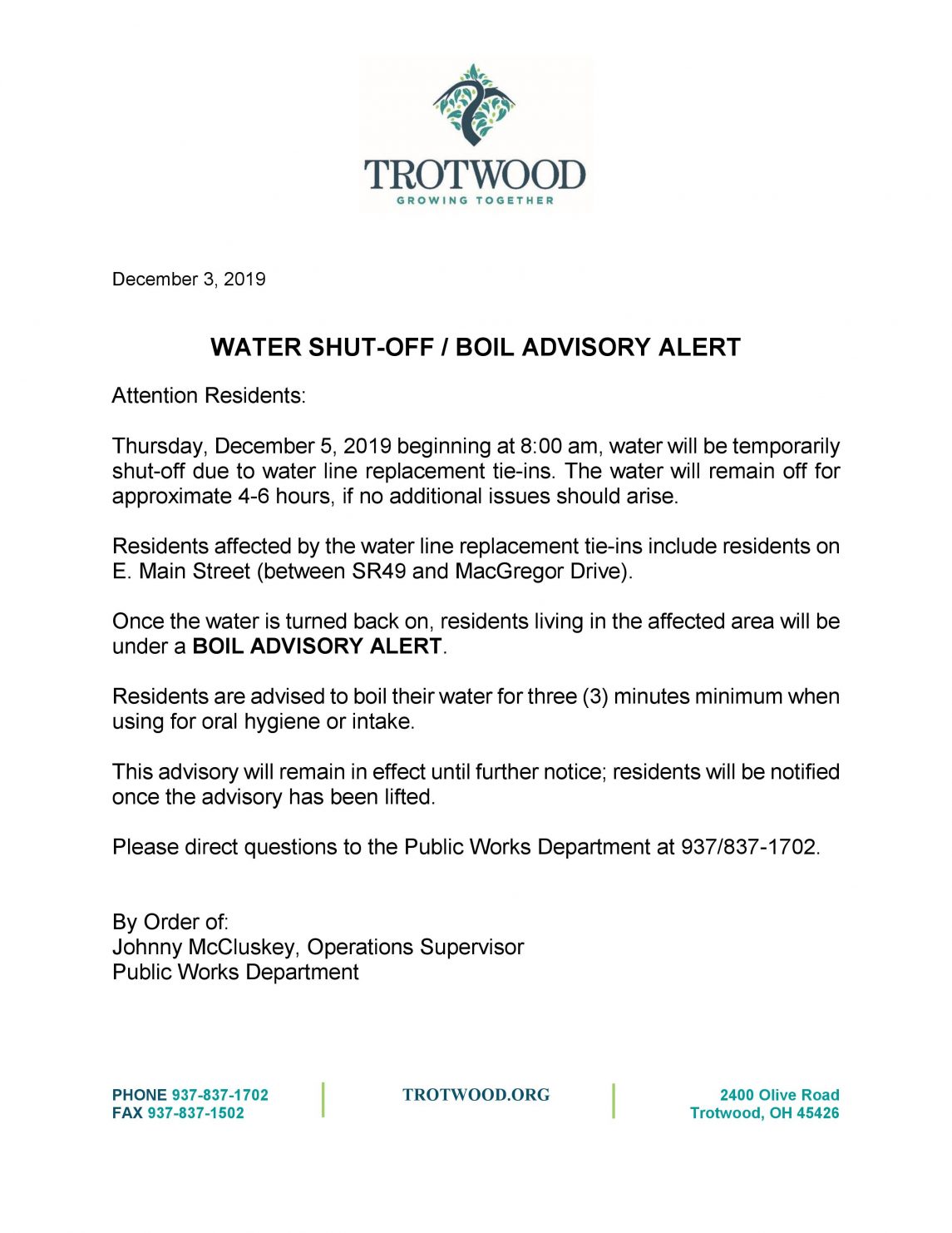 Thursday, December 5, 2019, 8:00 am, water will be temporarily shut off for 4-6 hours due to water line replacement tie-ins. Areas affected: East Main Street between SR49 and MacGregor Drive.